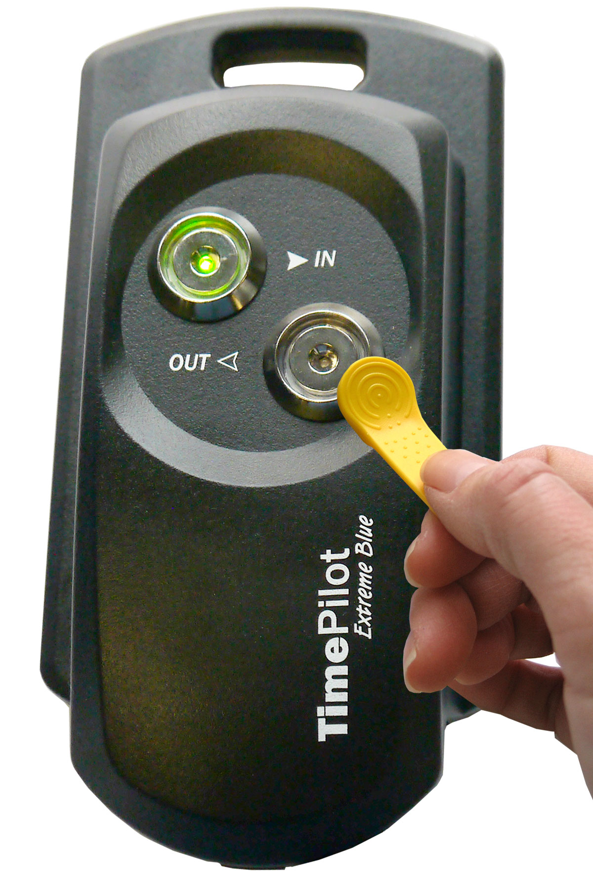 Employees clock in and out by tapping their iButton to "In" or the "Out" probe on the clock. A tone sounds and the probe lights up to confirm a successful transaction.