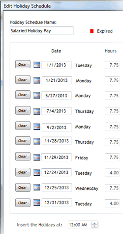 Now, each time you start TimePilot Central, the software looks at your holiday schedule(s) and determines if a holiday has occurred since the last time the software was started. If a holiday has occurred, the software then runs down the list of employees, looking for those with a holiday schedule that includes that holiday. When it finds one, it inserts into the employee’s record the number of hours you specified when you set up the schedule.
