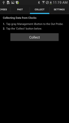 - Tap the included gray management iButton to the "In" probe of the clock. The lights on the two probes will begin flashing yellow in an alternating pattern while the clock readies the drive to write data. The probes’ lights will flash green as the clock writes the most recent data. When the lights stop flashing, a series of beeps will sound, indicating that the data has been written successfully.