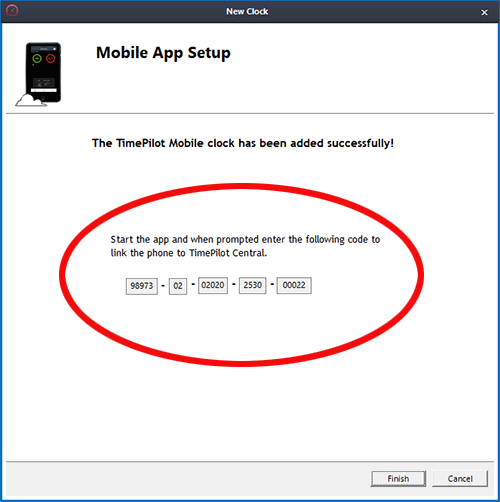 Note: You can also retrieve the registration number after you click "Finish" by right-clicking on the appropriate TimePilot Mobile icon in Clock Manager and selecting "Properties."