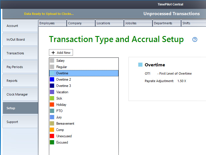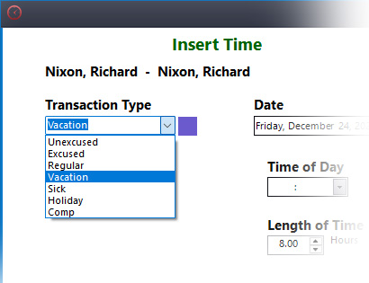 As you can see at right, the number of Transaction Types available to be assigned to Richard Nixon is fewer than those shown in the "Transaction Type and Accrual Setup" screenshot above. That's because the Pay Class assigned to Nixon specifies only seven possible types.