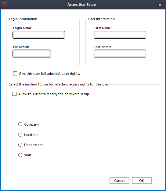 - Company/Location/Department/Shift: This is where you can limit the parts of your organization that the new user can see and work with. As you click one of these four categories, the various companies, locations, departments and shifts you set up when you set up TimePilot will appear. You can give employees access to any or all.